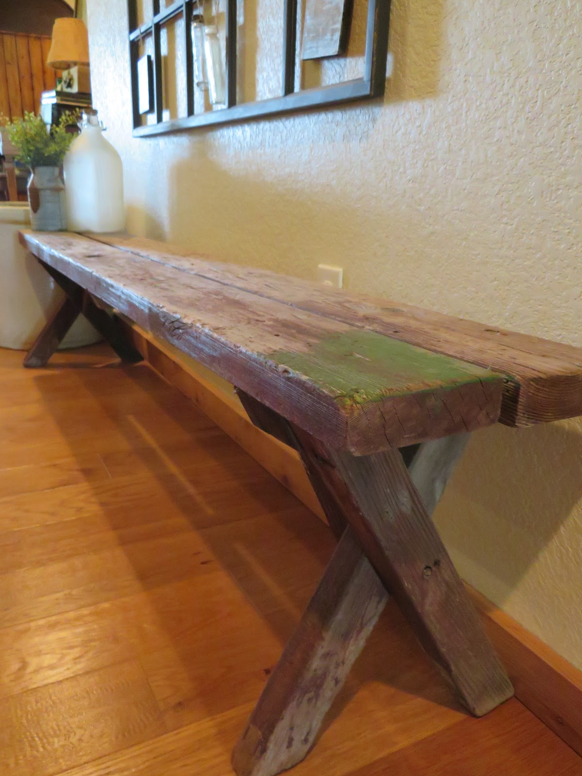 This bench used to live beside the shed at my Grandparents' house.  There were two of them beside each other and a popular place to sit and chat with all my cousins, aunts, and uncles.