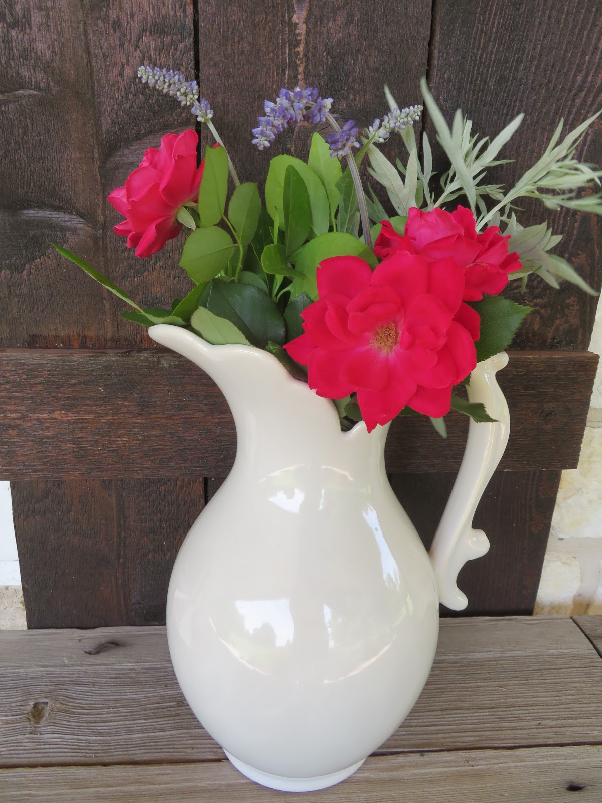 I like the versatility of farmhouse decor.  With its simple, timeless qualities, it is easy to switch things up.   One day you may find my ironstone pitchers being displayed in the kitchen, but on another day one might be on our coffee table holding fresh flowers.